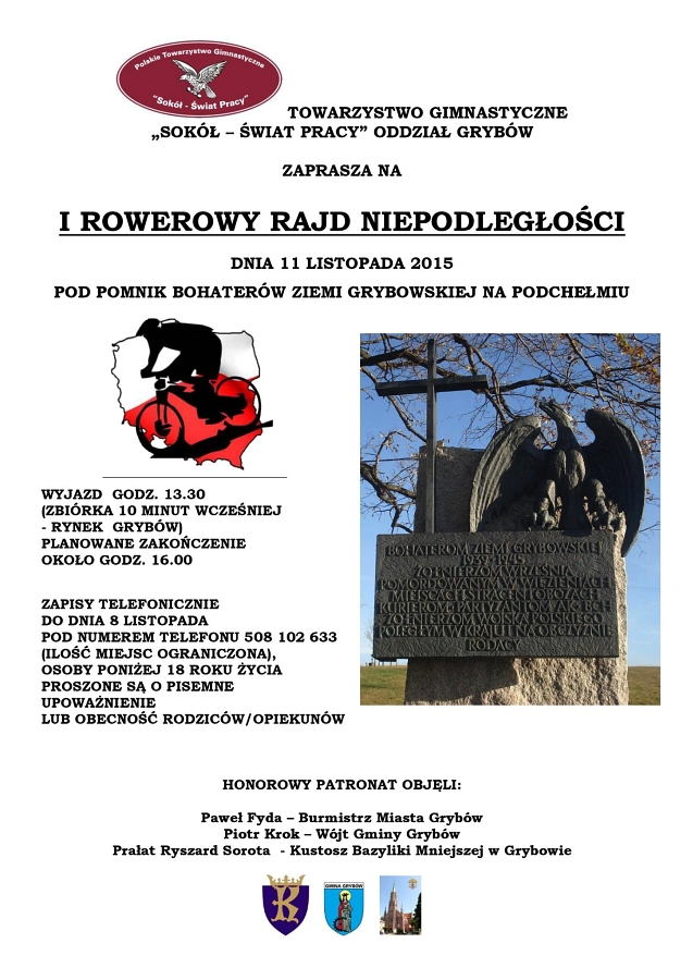 Towarzystwo Gimnastyczne „Sokół – Świat Pracy” oddział w Grybowie zaprasza wszystkich chętnych na rowerowy „Rajd Niepodległości”, który odbędzie się 11 listopada spod rynku w Grybowie pod pomnik Bohaterów Ziemi Grybowskiej na Podchełmiu.