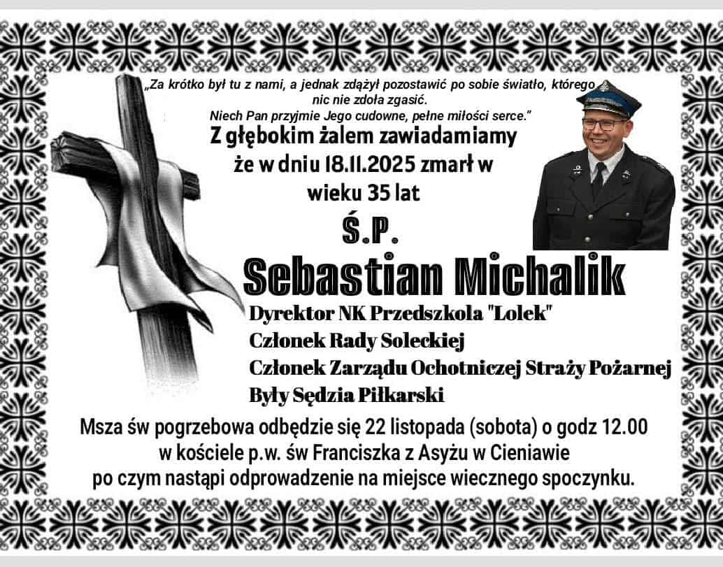 Dotarła do nas przykra wiadomość. Wczoraj (tj. 18.11.2025) zmarł dyrektor Katolickiego Niepublicznego Przedszkola „Lolek” w Cieniawie – Sebastian Michalik. Był założycielem placówki i wieloletnim druhem OSP Cieniawa. Miał 35 lat. Pogrzeb odbędzie się 22 listopada w kościele pw. św. Franciszka z Asyżu w Cieniawie.