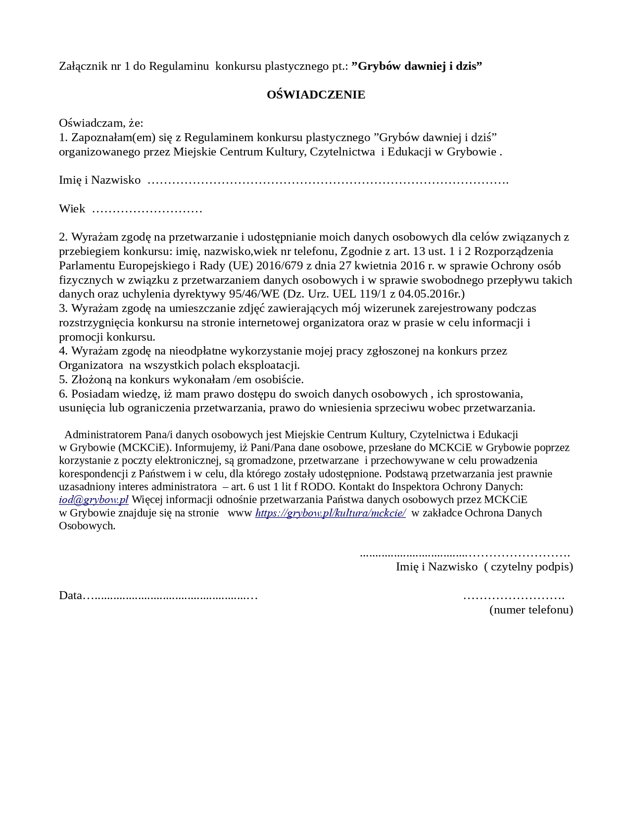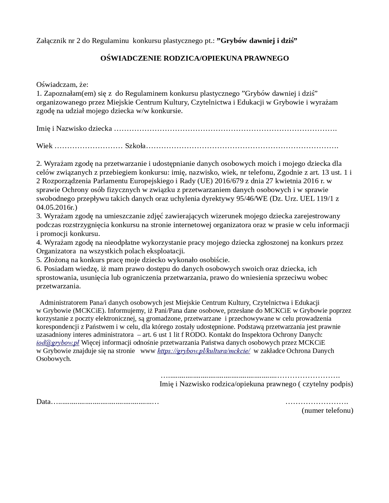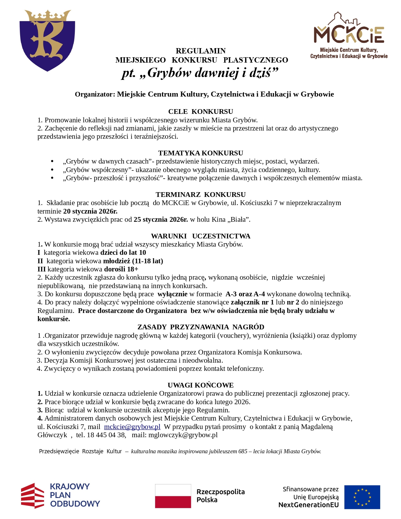 Szczegółowe informacje oraz regulamin konkursu dostępne są Facebooku Centrum Kultury w Grybowie. W przypadku pytań należy kontaktować się z Magdaleną Główczyk pod numerem telefonu 18 445 04 48 lub mailowo: [email protected].