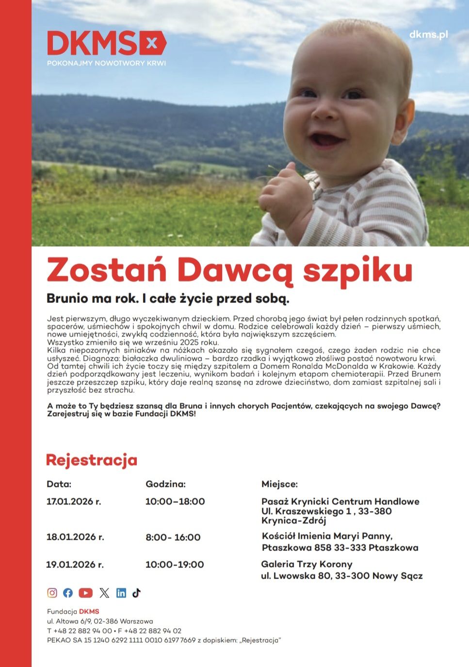 Trudno sobie wyobrazić, co czują rodzice małego Bruna z Ptaszkowej, który zaledwie kilka miesięcy po urodzeniu zachorował na białaczkę dwuliniową. Aby wesprzeć go w tej trudnej drodze, zachęcamy do zarejestrowania się w bazie Fundacji DKMS. Być może to właśnie ktoś z was okaże się bliźniakiem genetycznym Bruna.