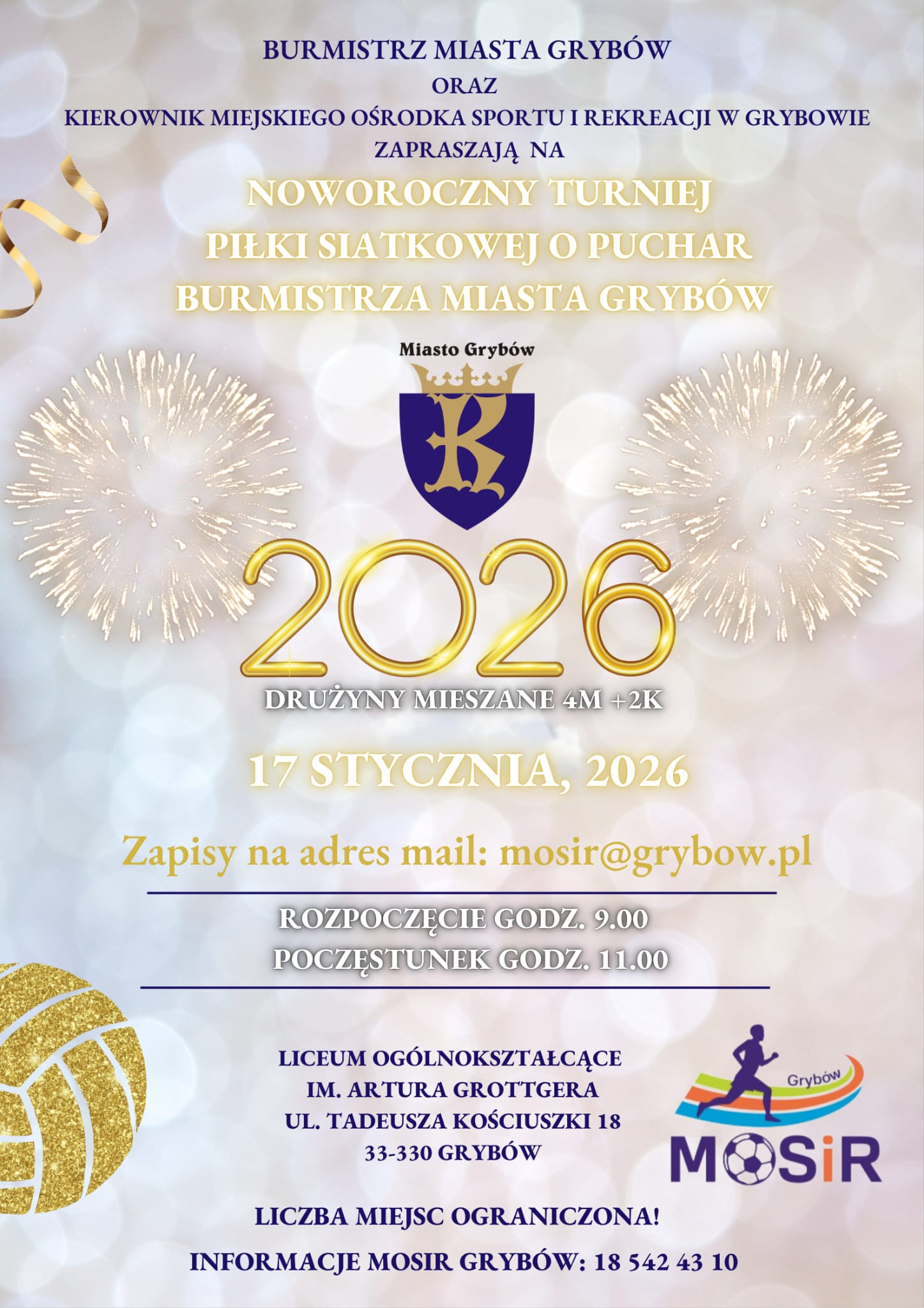 Noworoczny Turniej Piłki Siatkowej o Puchar Burmistrza Miasta Grybów odbędzie się 17 stycznia w Liceum Ogólnokształcącym im. Artura Grottgera w Grybowie. W sportowym wydarzeniu mogą wziąć udział sześcioosobowe drużyny mieszane składające się z 4 mężczyzn i 2 kobiet. Na uczestników czeka poczęstunek. Startujemy o godzinie 9!