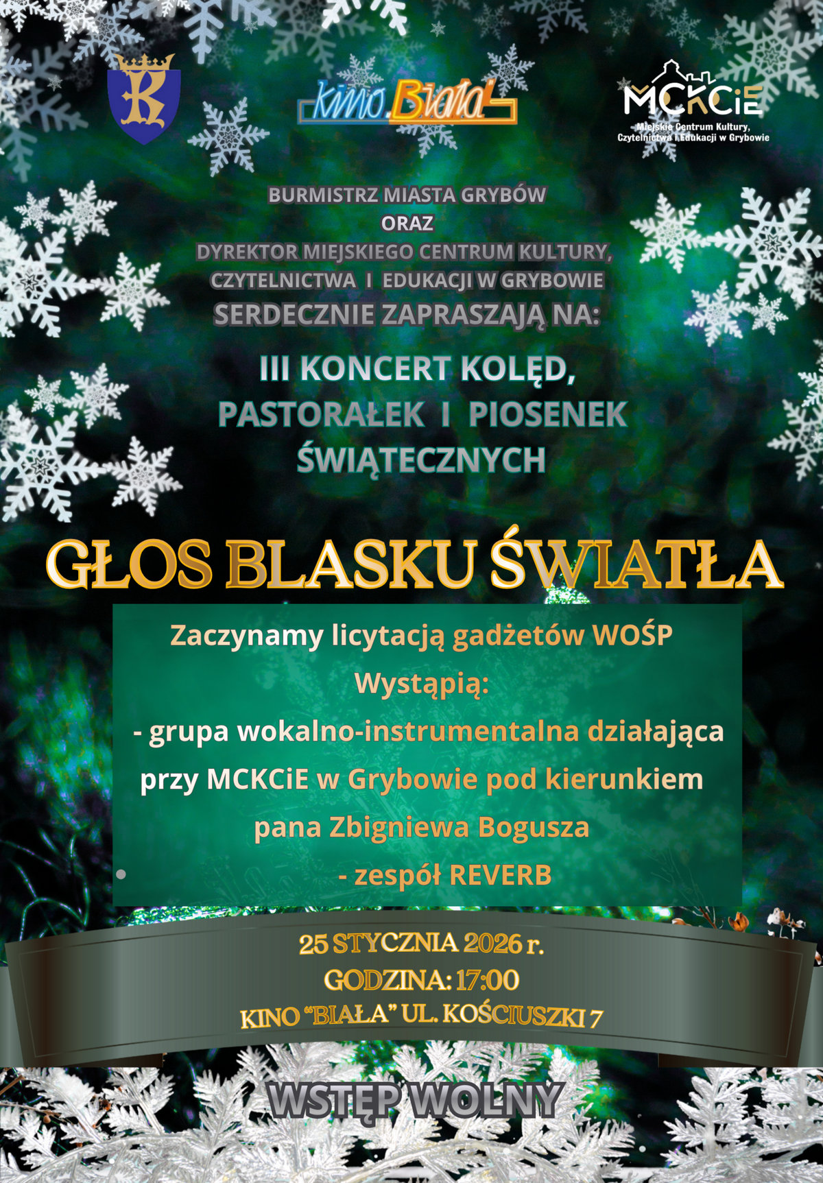 Burmistrz miasta Grybów oraz dyrektor Miejskiego Centrum Kultury, Czytelnictwa i Edukacji w Grybowie zapraszają na obchody 34 finału Wielkiej Orkiestry Świątecznej Pomocy. Tym razem pomaganie przyjmie muzyczną formę, ponieważ czeka nas III Koncert Kolęd, Pastorałek i Piosenek Świątecznych „Głos blasku światła” w wykonaniu grupy wokalno-instrumentalnej działającej przy MCKCiE pod kierunkiem pana Zbigniewa Bogusza oraz zespół REVERB.