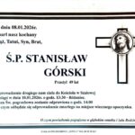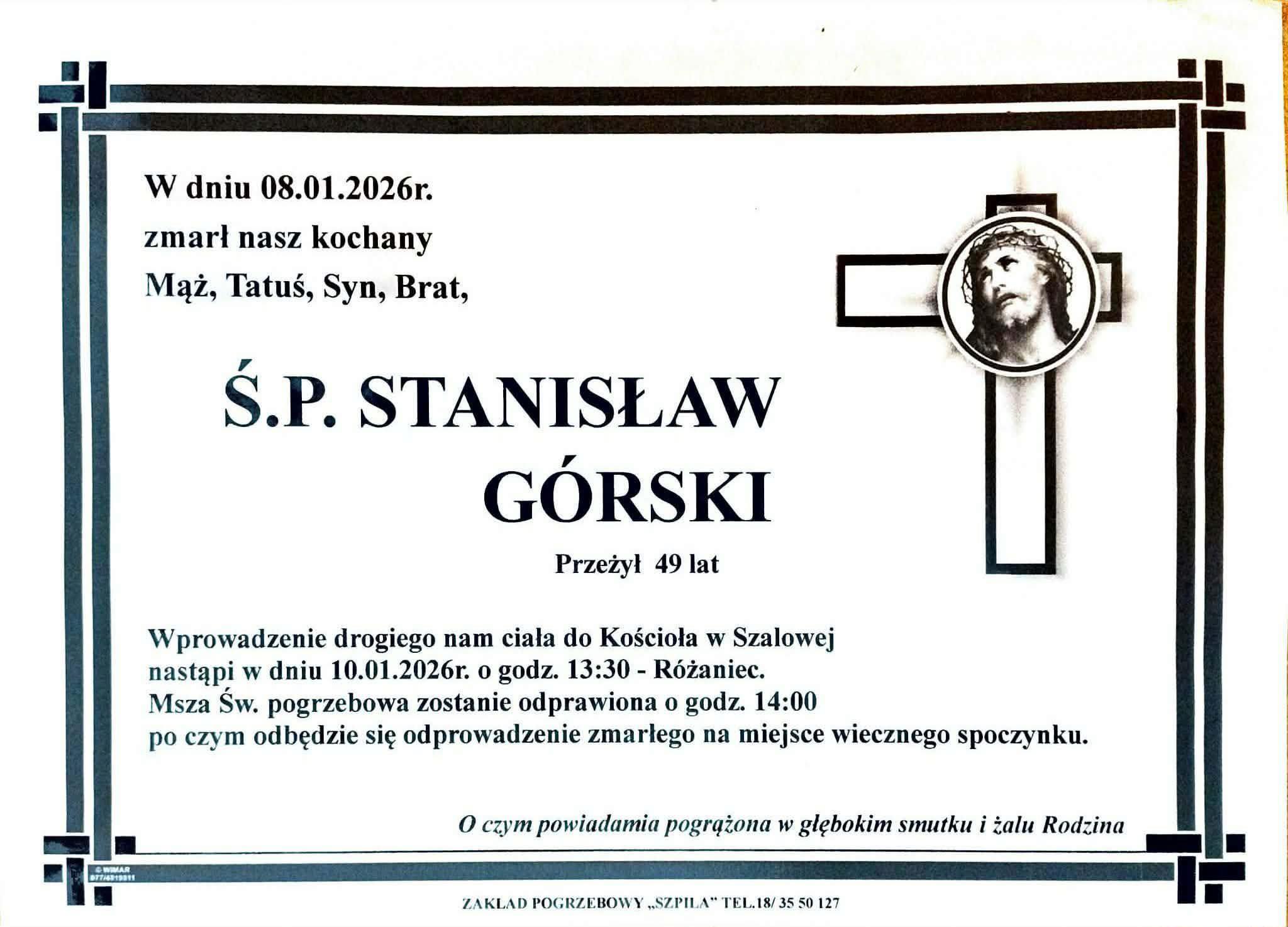 Pogrzeb śp. Stanisława Górskiego odbędzie się w Kościele św. Michała Archanioła w Szalowej 10 stycznia o godzinie 14. O godzinie 13.30 zostanie odmówiony różaniec. Po mszy świętej ciało zmarłego zostanie odprowadzone na miejsce wiecznego spoczynku.