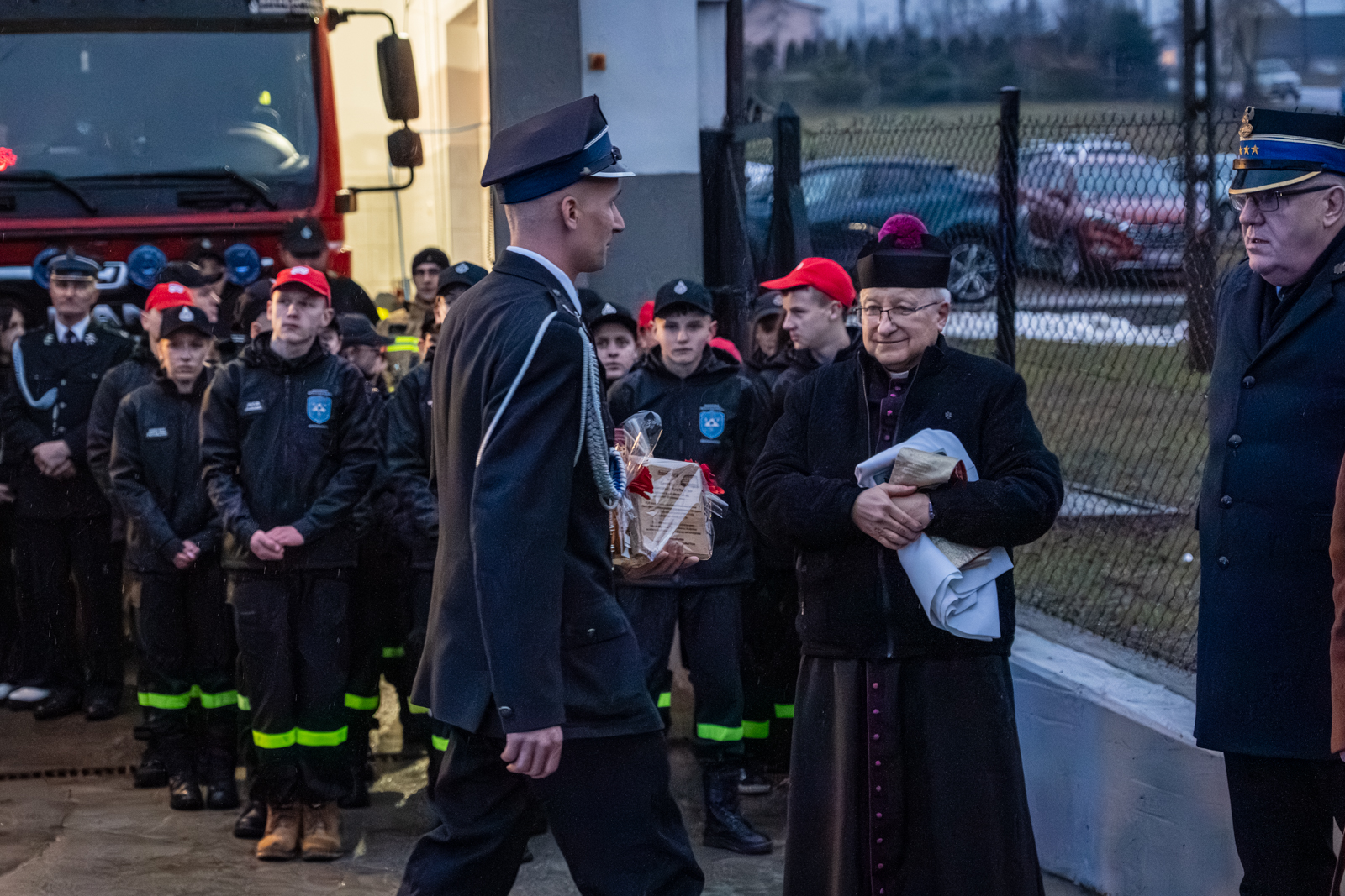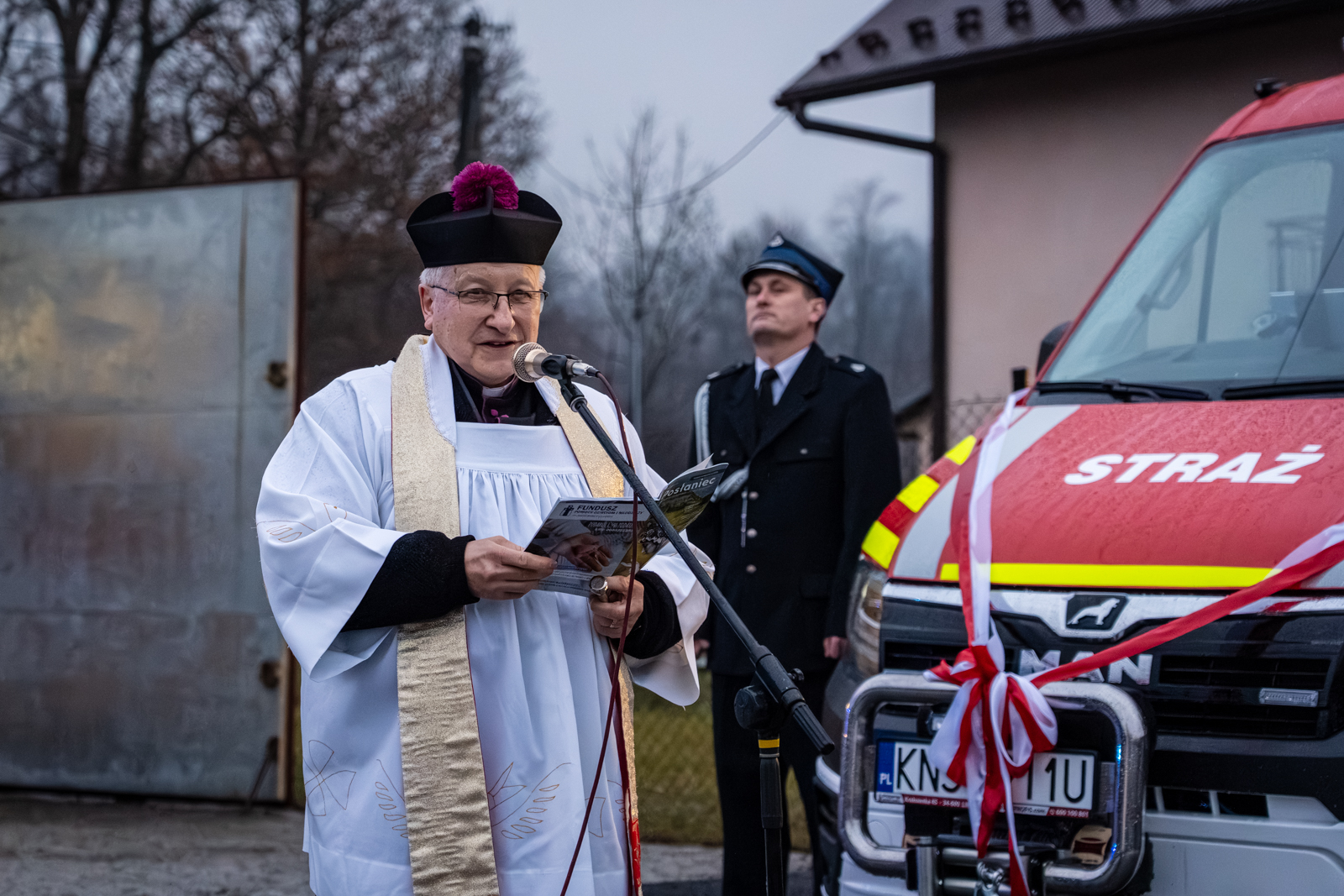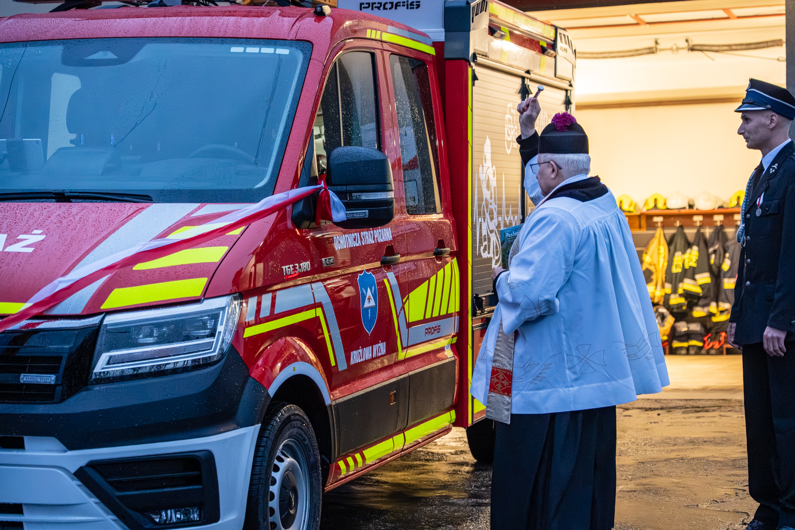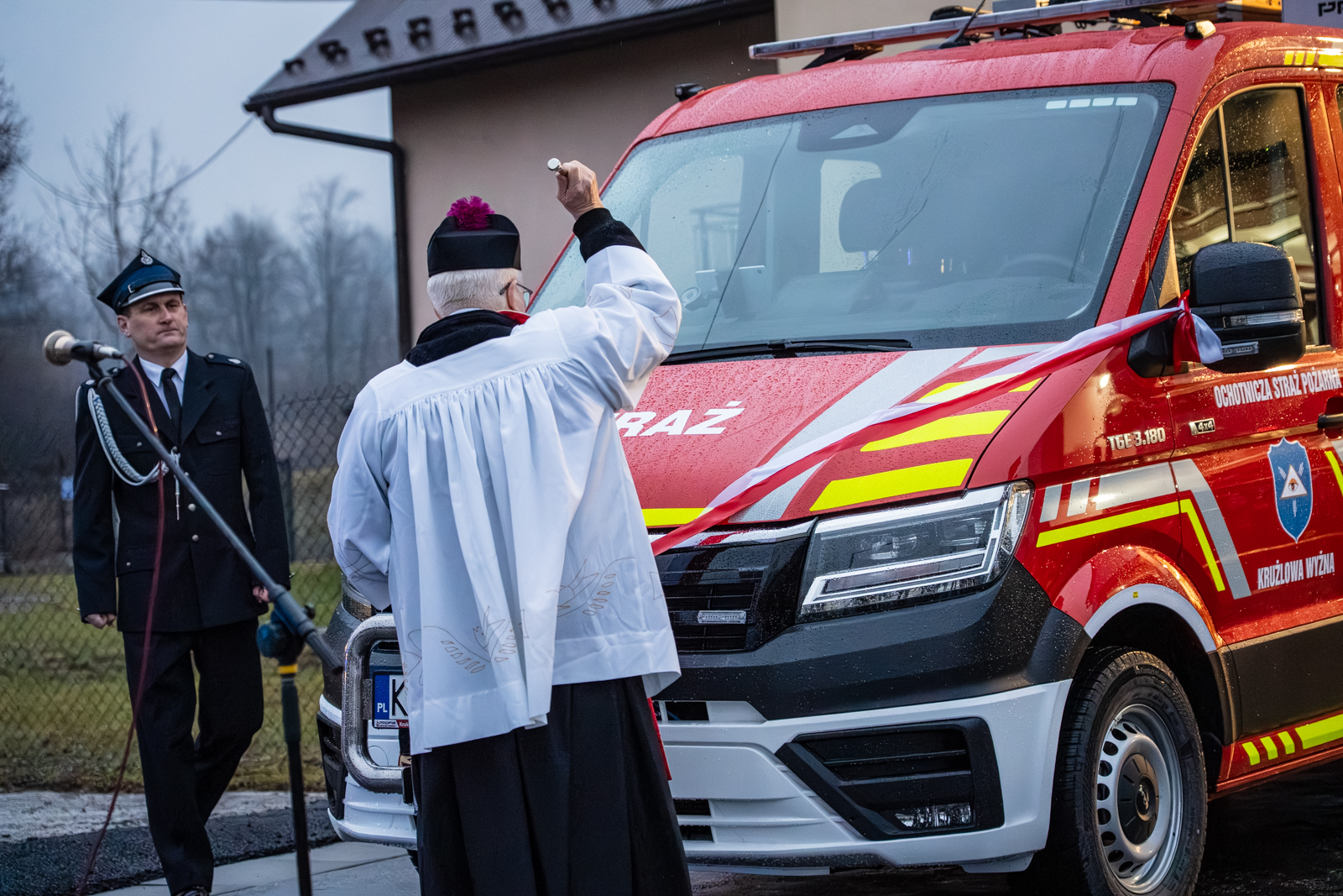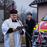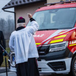 Następna część obchodów rozpoczęła się od poświęcenia nowego pojazdu przez księdza prałata Marka Szewczyka, który odmówił modlitwę w intencji jego bezpiecznego użytkowania oraz wszystkich druhów korzystających z samochodu. Następnie nastąpiło oficjalne przekazanie dokumentów i kluczyków strażakom. W dalszej części uroczystości zaproszeni goście wspólnie przecięli wstęgę, symbolicznie witając nowy wóz w jednostce.