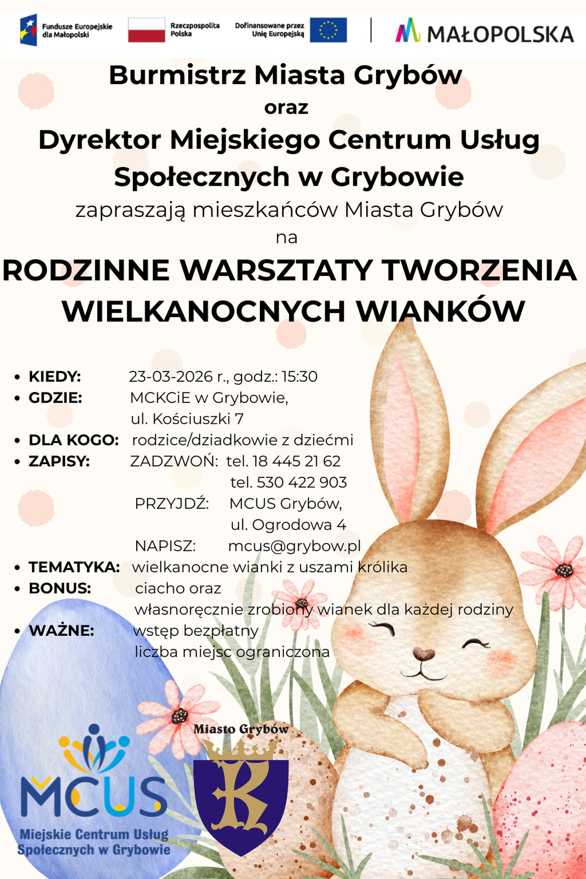 Wstęp jest bezpłatny – obowiązują zapisy. Więcej informacji pod numerami 18 445 21 62 i 530 422 903. Można również przyjść do siedziby MCUS-u (ul. Ogrodowa 4) lub napisać na adres e-mail: mcusgrybow.pl. Zapraszamy w imieniu organizatorów!