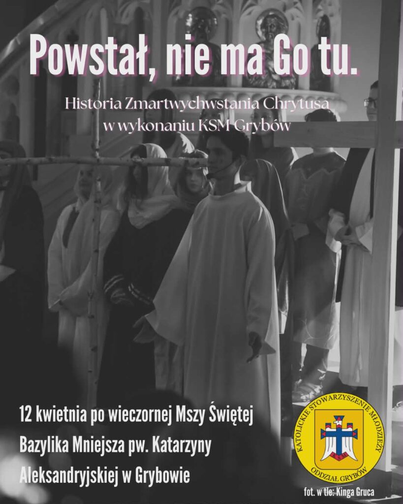 12 kwietnia, po wieczornej Mszy Świętej około godziny 19:00, w bazylice pw. św. Katarzyny Aleksandryjskiej w Grybowie odbędzie się wyjątkowe wydarzenie przygotowane przez młodzież z Katolickiego Stowarzyszenia Młodzieży. Będzie to opowieść o Zmartwychwstaniu Chrystusa – skierowana do wszystkich, którzy chcą zatrzymać się na chwilę i wejść w głębszy wymiar przeżywania wiary.